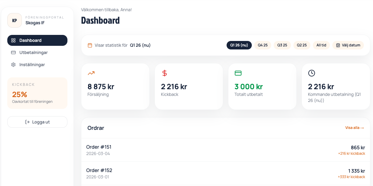 Varje förening får en egen portal med tydlig överblick över intäkter, nästa utbetalning och uppgifter.